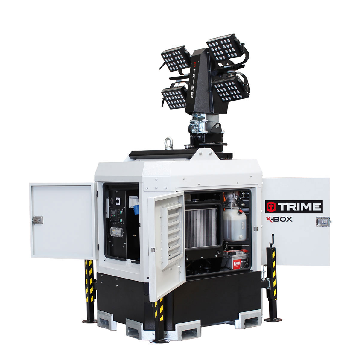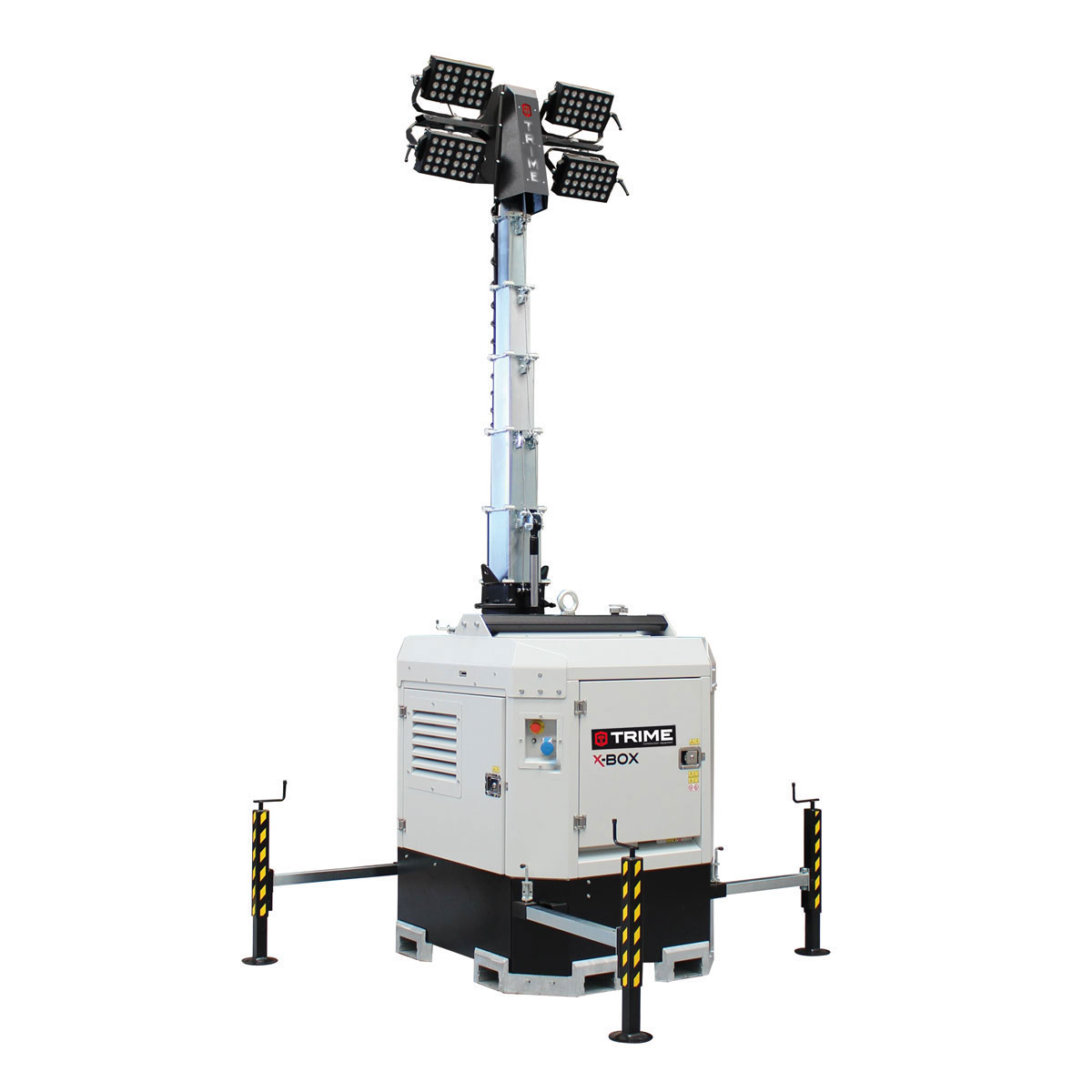 X-Box 4x300W ir 8.5-metrus augsts gaismas tornis ar 48V LED. Izgaismotais laukums 4500 m². Pielietojums: Celtniecības objektos, pasākumos, ceļubūvē, rūpnieciskās ēkās utt.